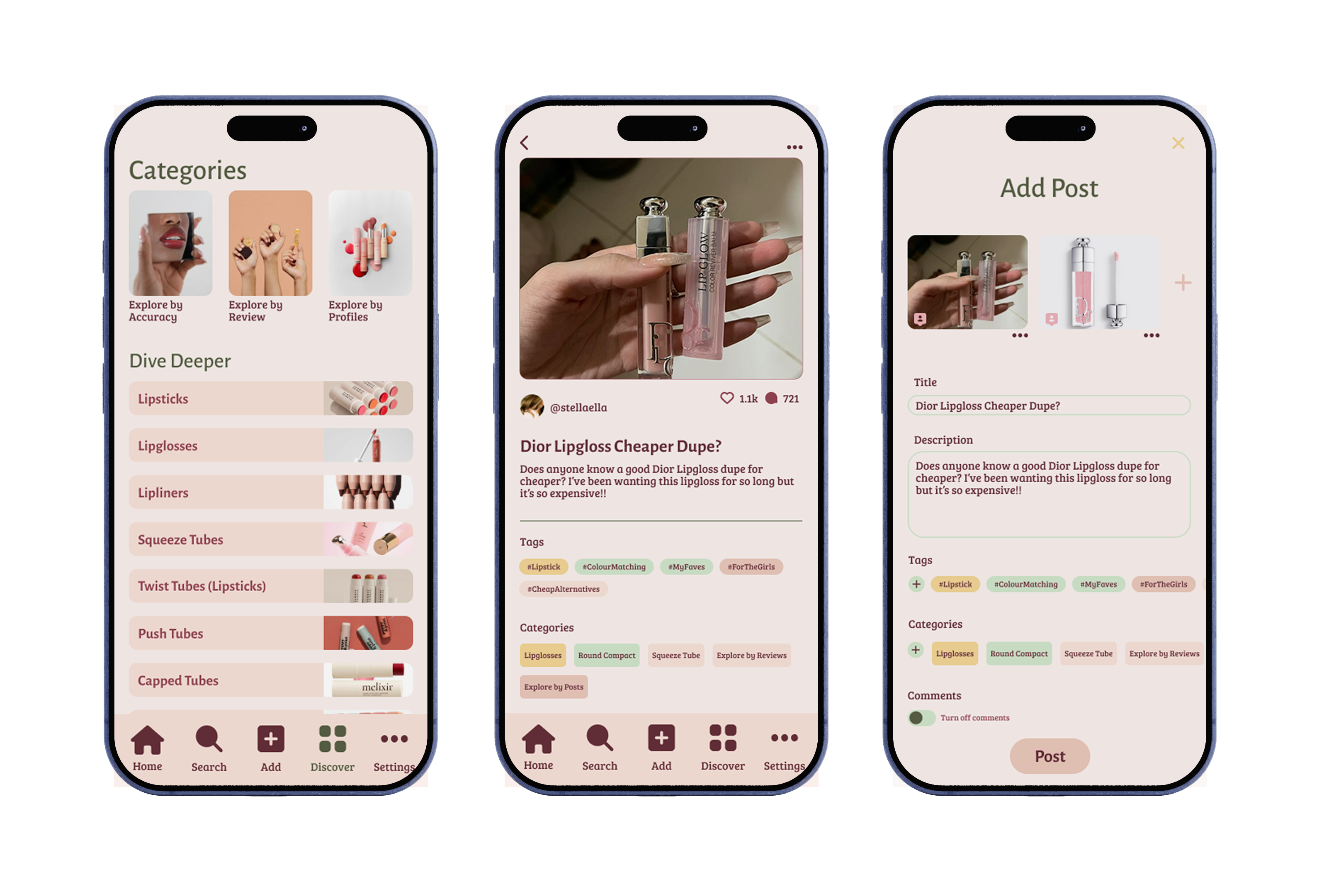 The design for the app was to create an inviting and safe space for users of all races, sexualities and genders to interact with one another and feel comfortable asking for help. The goal was to create a personalized experience with real people having tested products in the past in order to make the responses as accurate as possible. The overall layout was supposed to resemble social apps such as Instagram, Twitter and Pinterest whilst also being its own thing and living within its own category (said category did not exist prior).