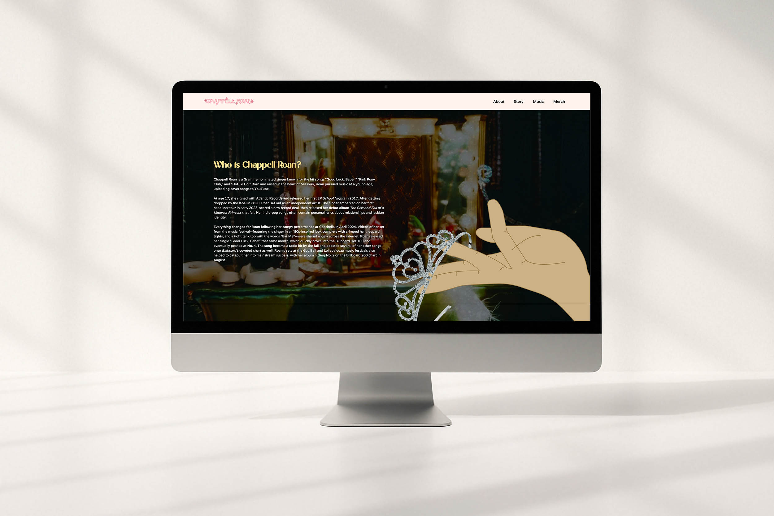 My design decisions created a promotional website that would serve to showcase the new song released by Chappell Roan and to promote her as an artist itself and to establish the history behind how she got to where she is today and her brand as an artist. It also acted as an aesthetically pleasing, visually appealing way to show off the new single released by the artist and acted as a kind of fun way for me to experiment.